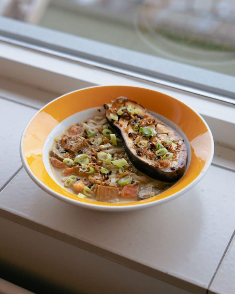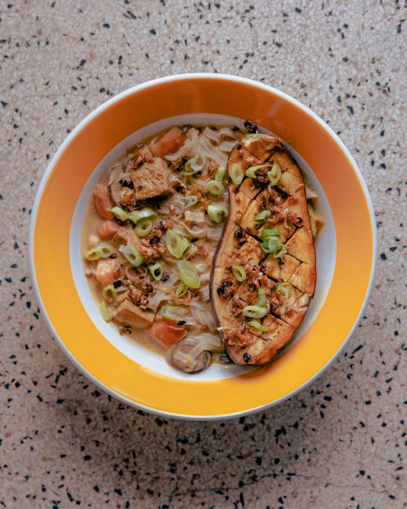 • Verwarm de Cari Chay in een pannetje op laag vuur tot het goed heet is en meng dit vervolgens met de gekookte noedels. Verdeel de noedels over de borden, leg op elk bord een halve aubergine en schenk de saus erover. Garneer met het fijngesneden groene deel van de bosui.