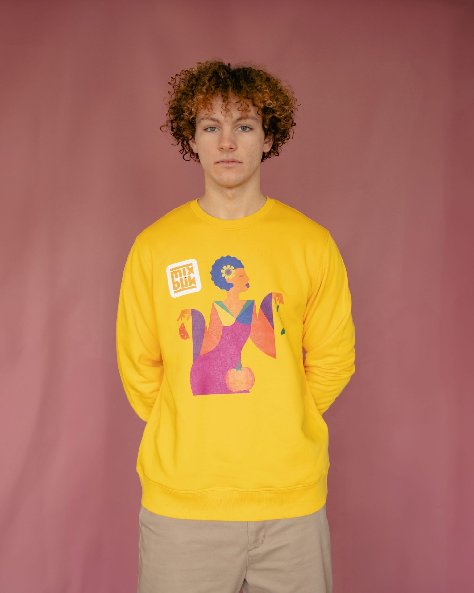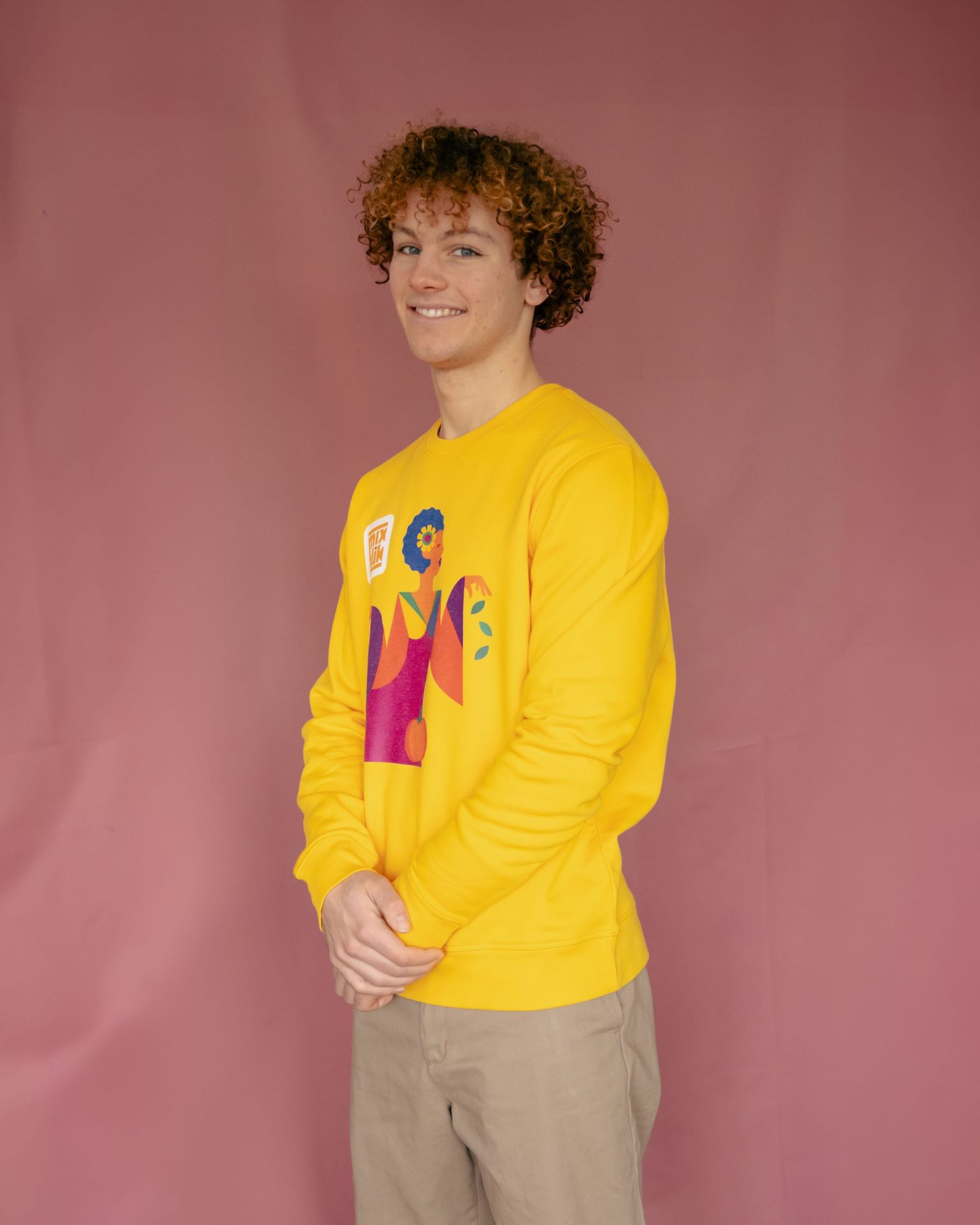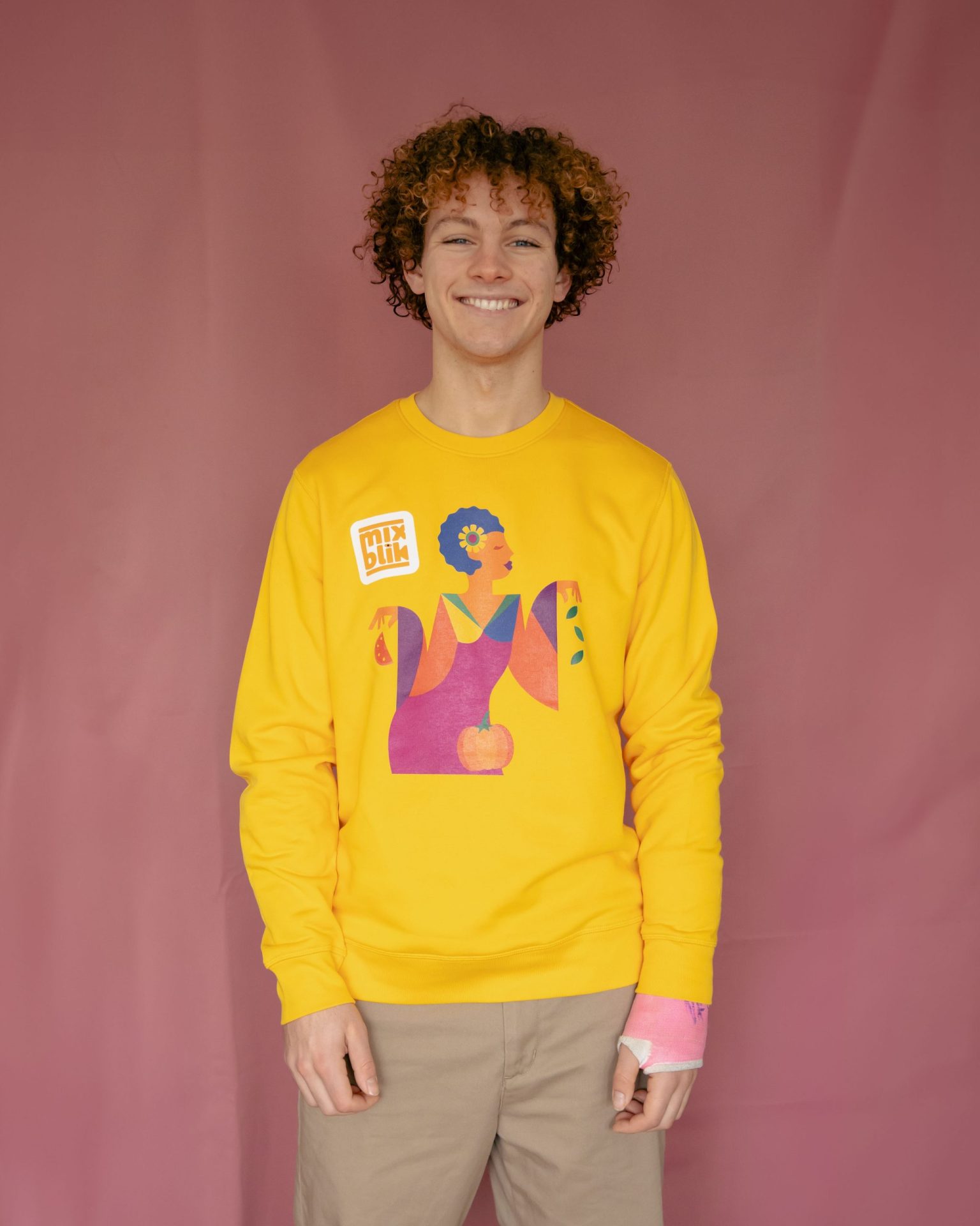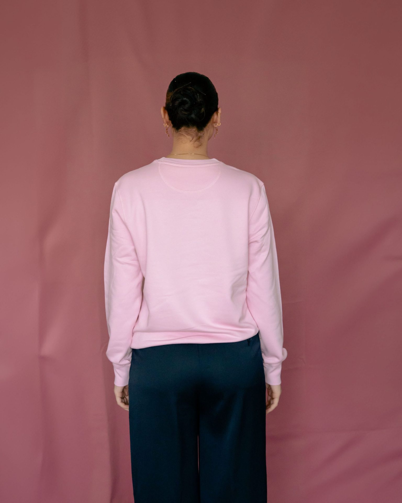 De trui is beschikbaar in twee kleuren: Roze en Geel, in de maten S, M, L en XL.