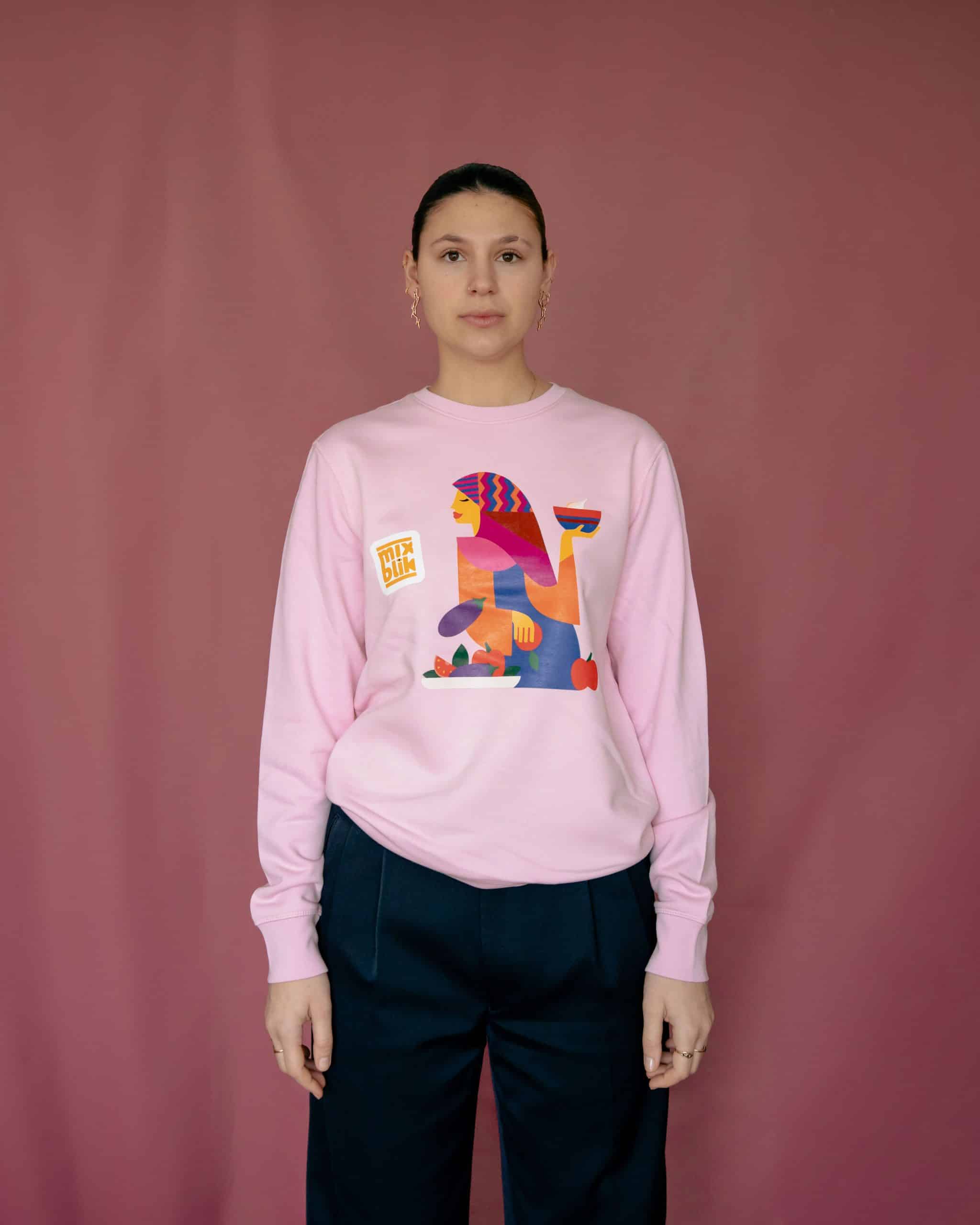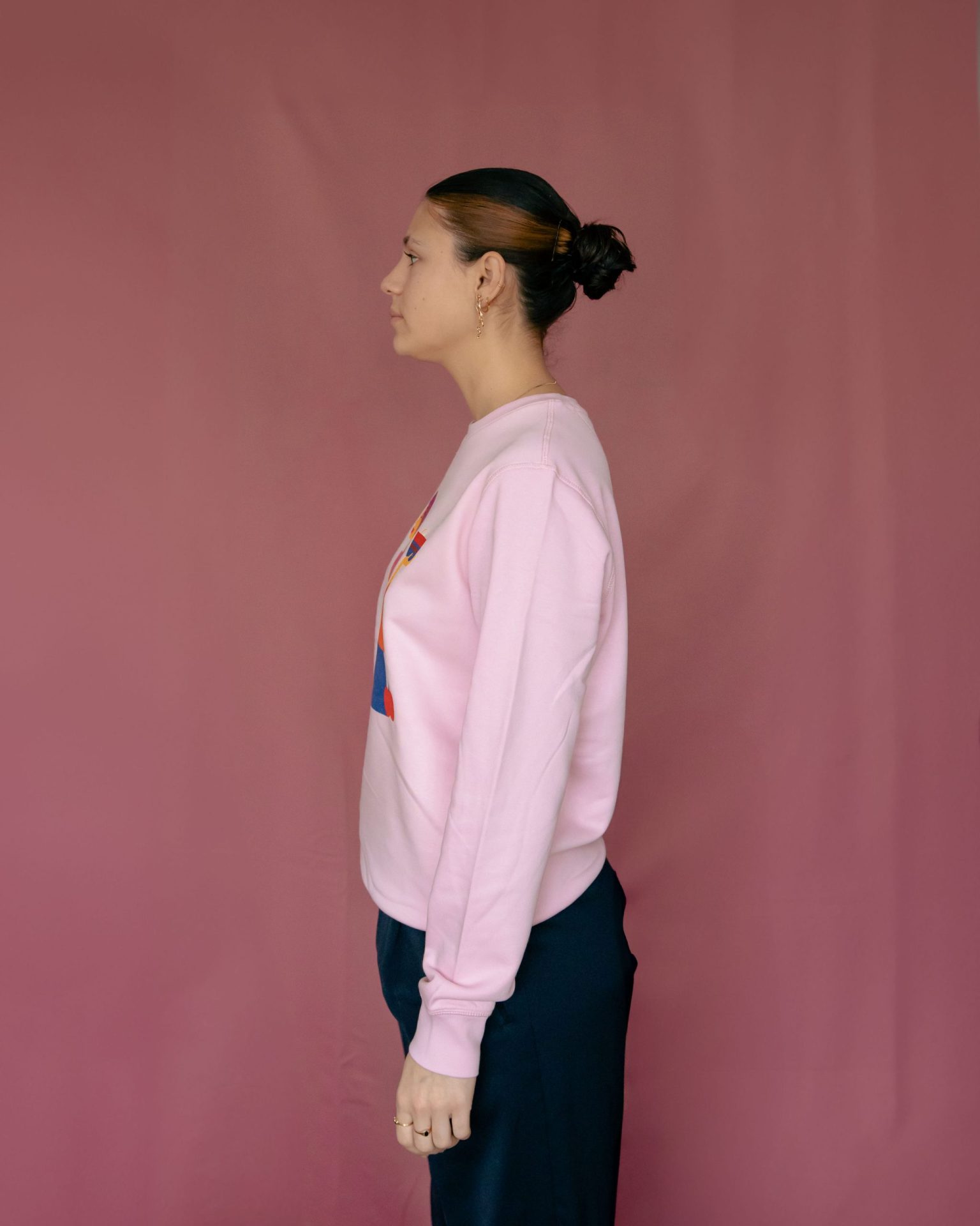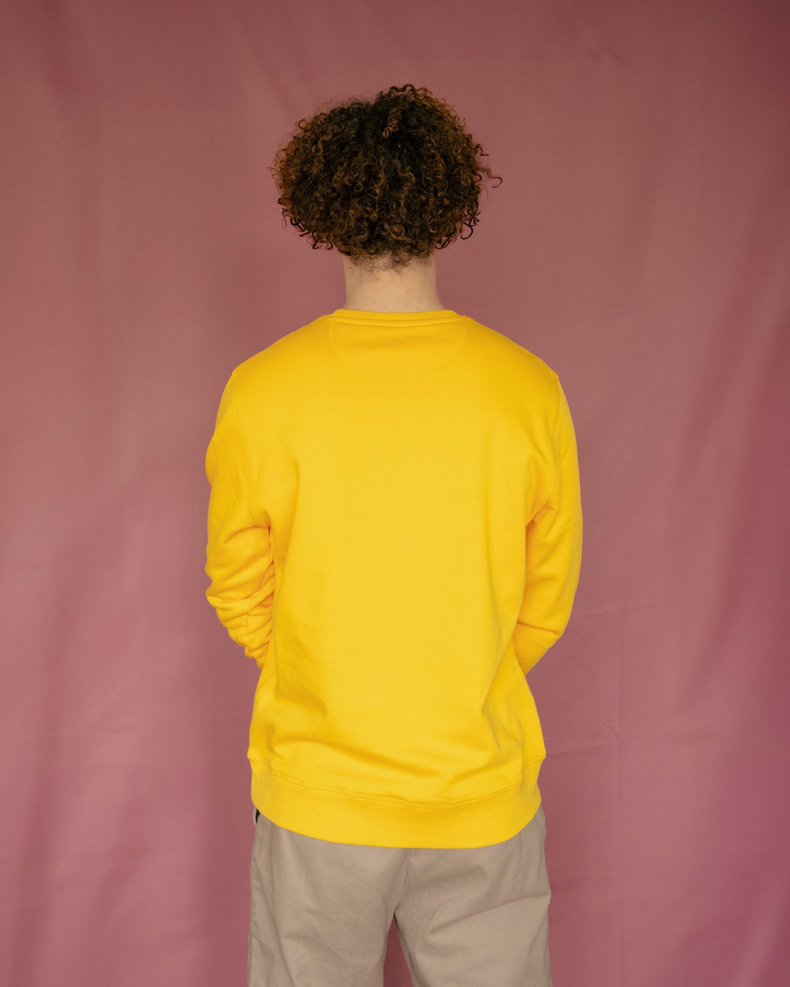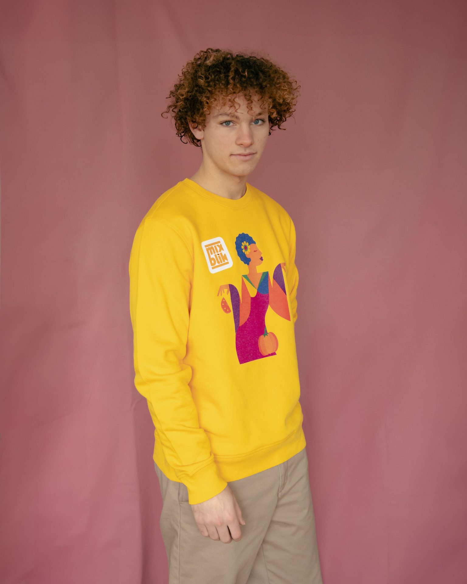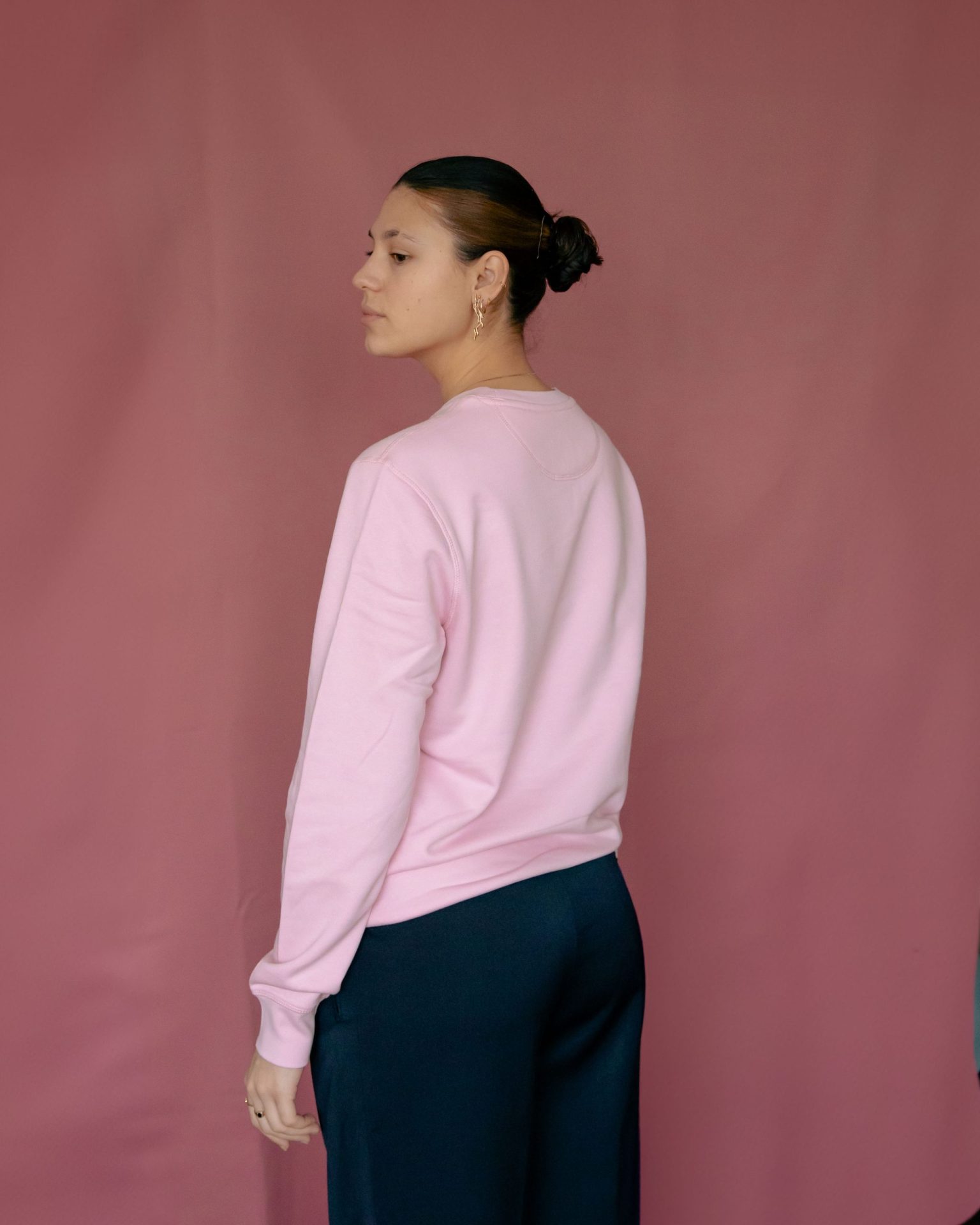 De trui is beschikbaar in twee kleuren: Roze en Geel, in de maten S, M, L en XL.